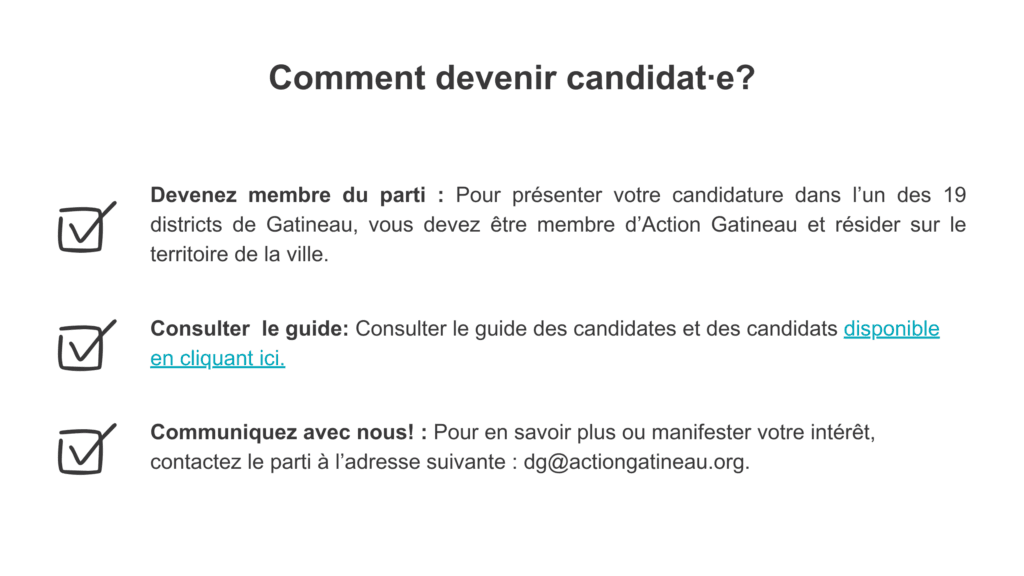 Vous souhaitez vous engager dans votre communauté, faire une différence et porter la voix des Gatinoises et des Gatinois autour de la table du conseil municipal?